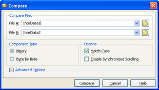 要做到这一点,请用 Ctrl+M 打开“比较”对话框,然后在 “文件A”字段输入接口中加载的文件名称(本例中) 它会是如下所示的“IntelData1”,而不是“IntelData1.hex”)。